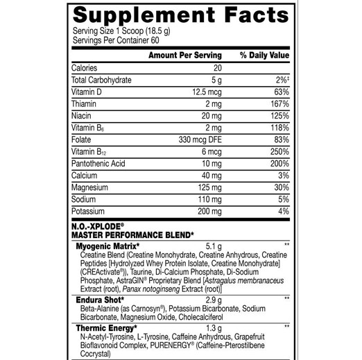 Fuel your body with advanced ingredient technology to help push you past previous limits. N.O.-Xplode is scientifically engineered to support explosive energy, enhanced endurance, and maximum performance during your training.