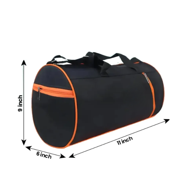 This gym bag is constructed from a durable poly-cotton blend fabric, offering a balance of strength and a soft-touch finish. The bag features a 16-inch length and 8-inch diameter, providing a compact cylindrical shape suitable for daily workout gear. The main body is designed in solid black with high-visibility orange zippers and trim for a high-contrast look. It includes a spacious central compartment for storing apparel, towels, and personal fitness accessories. A dedicated front zippered pocket is integrated into the side for organized access to smaller items like keys or mobile devices. Carrying options include dual reinforced top handles made of heavy-duty webbing for hand-carry convenience. The lightweight fabric construction makes it an easy-to-carry companion for gym sessions, sports, or short-distance travel. To maintain the bag, it is recommended to spot clean with a damp cloth; do not machine wash or use abrasive detergents.